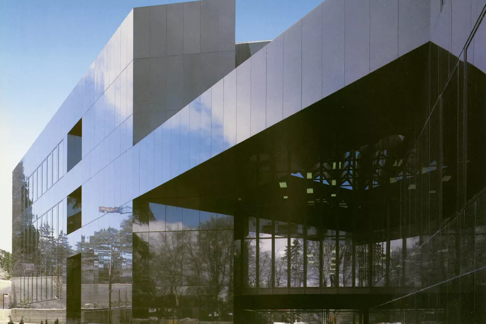 Les deux matériaux employés pour les façades nouent une relation particulière avec cette végétation : le verre, jouant un rôle de miroir, permet à l’édifice de se fondre dans son environnement naturel dont il reflète les feuillages. Le granit vert Labrador, lui, varie selon l’éclairage naturel, allant d’un vert intense à un noir brillant, faisant écho aux tonalités et aux couleurs du paysage.