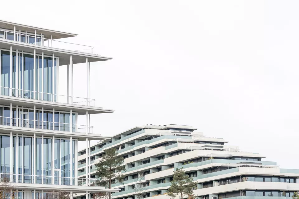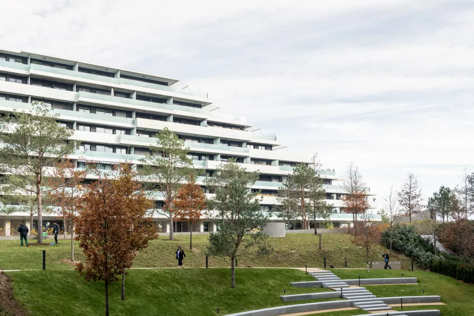 Les façades largement vitrées, soulignées de bacs à plantes, allègent le programme et donnent à l’ensemble une expression vivante. Dans cette logique d’ouverture sur les quatre orientations, le projet intègre des espaces extérieurs privés : des balcons de dimensions variées qui prolongent le paysage, enrichissent la vie des usagers et inscrivent la nature au cœur de l’architecture.