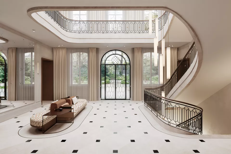 Ce palais de style XVIII ème à été construit dans les années 60 dans le respect strictes des règles et codes de mouvement néo-classique. Le projet de transformation à pour but de retravailler l’ensemble de l’édifice pour l’adapter aux modes de vies contemporains et de l’ouvrir plus largement sur le paysage lacustre avoisinant.