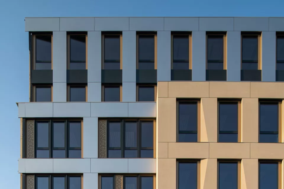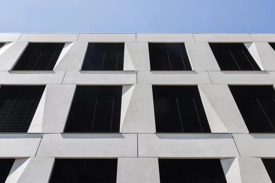 De loin, la disposition rythmée des fenêtres hautes réduit l’effet monolithique des volumes. De près, un léger jeu de plis sur les éléments préfabriqués répond à la cadence des axes à forte circulation.