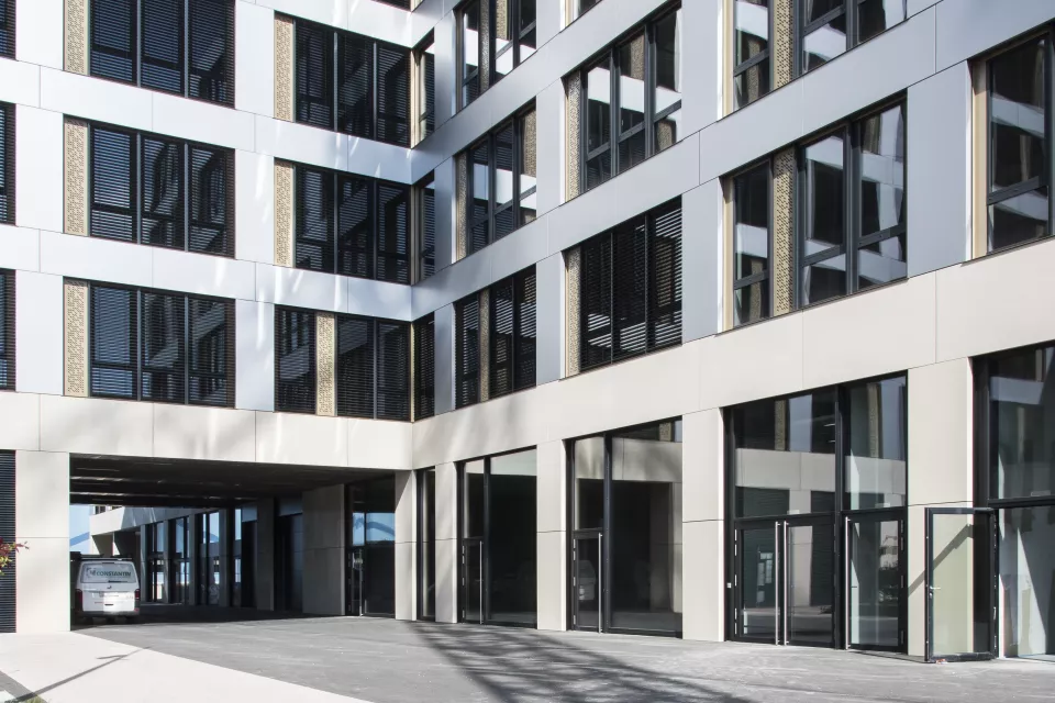 Les façades varient : métal et verre, légers, côté cour ; béton fibré, plus urbain, côté rue. De grands portiques relient les rues animées aux cours intérieures calmes et protégées.