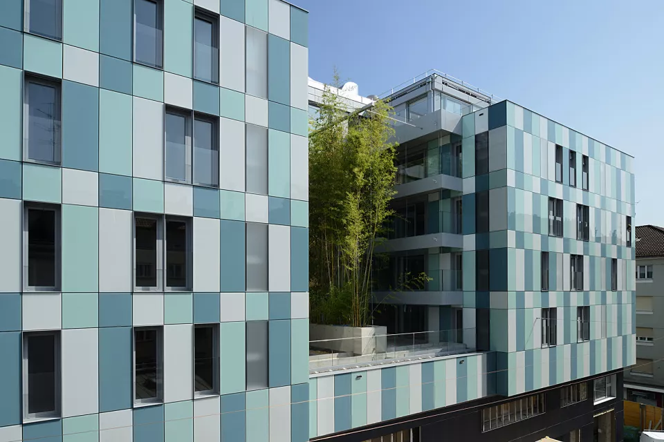 Le socle, bien ancré au sol, est massif, accueillant pour quelques années encore le centre de Swisscom. Les étages, quant à eux, s'élèvent avec légèreté dans le ciel. Le jeu de renfoncements permet de créer des espaces semi-privés où sont posés les balcons, évitant ainsi le bruit des rues adjacentes. Les panneaux composant les façades sont de différentes teintes de bleu, variant perpétuellement avec le changement du ciel et la course du soleil.