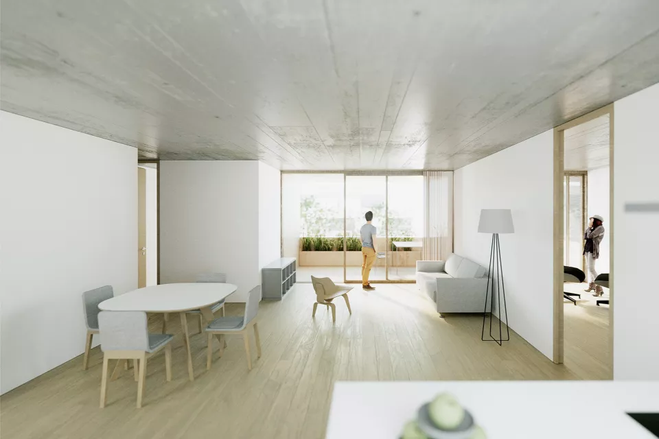 Après la mise au concours de la Fondation pour la promotion de logement bon marché et l'habitat coopératif (FLPC), deux projets sont retenus, dont notre projet issu de la collaboration avec jbmn architectes. jbmn et Favre+Guth ont obtenu le deuxième prix du concours pour la réalisation des lots D-E-L13 du quartier de l'Adret. La FPLC a attribué à notre consortium la réalisation d’un immeuble de 24 logements.