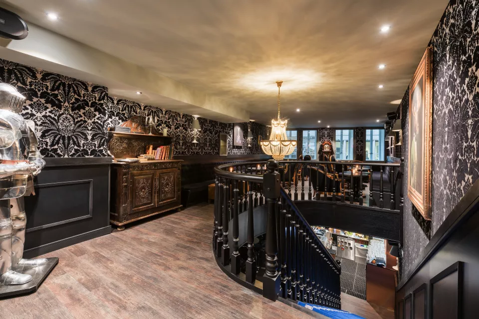 Le choix des objets surréels apporte l’esprit excentrique des collectionneurs anglais et ses cabinets de curiosités. Les tonalités foncées des meubles et murs harmonisent les objets de différentes couleurs et formes. Certains éléments de mobilier ont été dénichés chez des antiquaires et rénovés. Les tableaux accentuent l’idée de dynastie avec humour.