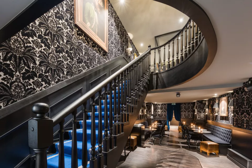 L’intégration des deux étages se fait par le vide proche de l’escalier qui augmente la qualité de l’espace et renforce l’idée de maison du XVIIIe siècle. Le concept est d’attirer le public dans un espace surréel et décalé pour profiter d’un bon cocktail.