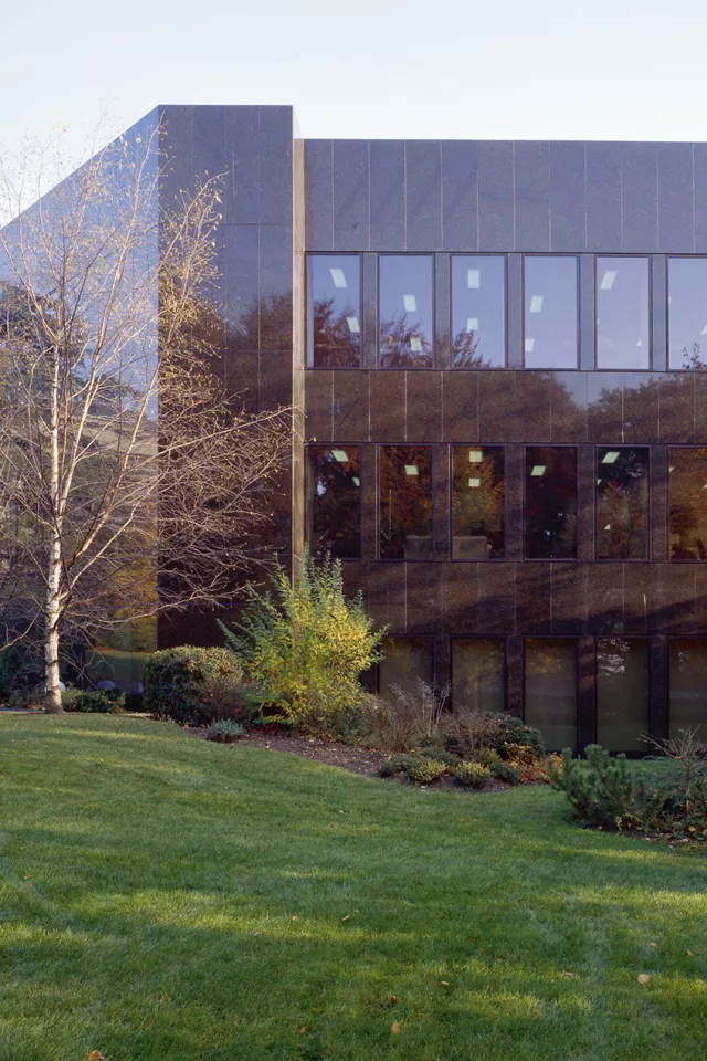 Les deux matériaux employés pour les façades nouent une relation particulière avec cette végétation : le verre, jouant un rôle de miroir, permet à l’édifice de se fondre dans son environnement naturel dont il reflète les feuillages. Le granit vert Labrador, lui, varie selon l’éclairage naturel, allant d’un vert intense à un noir brillant, faisant écho aux tonalités et aux couleurs du paysage.