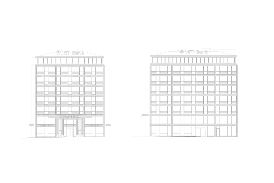 La mission principale du bureau, en collaboration avec l'architecte Benoît Dubesset, est de renouer avec le bâtiment d'origine signé Marc-Joseph Saugey. Dans la continuité des principes de ce dernier, une trame rigoureuse marquée par des lignes horizontales et verticales ainsi qu'un double socle à usage commercial sont repris. Il est aujourd'hui occupé par une prestigieuse joaillerie. Achevé en 2015, ce bâtiment restitue à la Ville de Genève un objet de grande valeur architecturale.