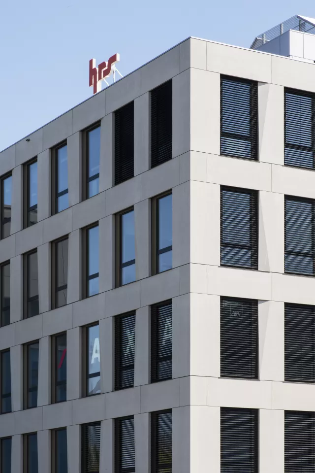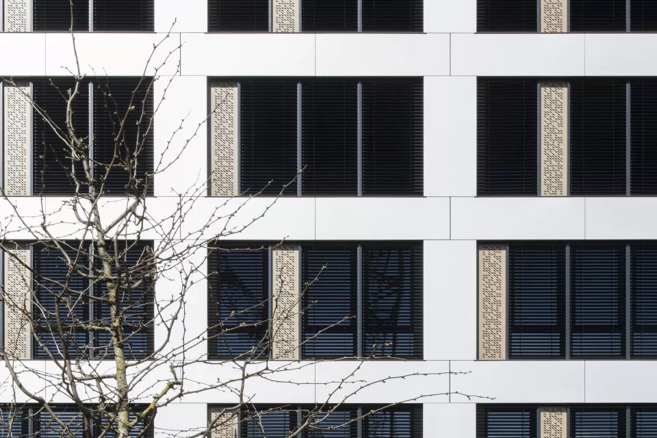 De loin, la disposition rythmée des fenêtres hautes réduit l’effet monolithique des volumes. De près, un léger jeu de plis sur les éléments préfabriqués répond à la cadence des axes à forte circulation.