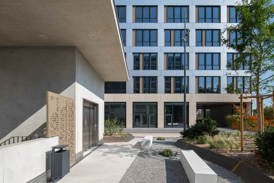 Les façades varient : métal et verre, légers, côté cour ; béton fibré, plus urbain, côté rue. De grands portiques relient les rues animées aux cours intérieures calmes et protégées.