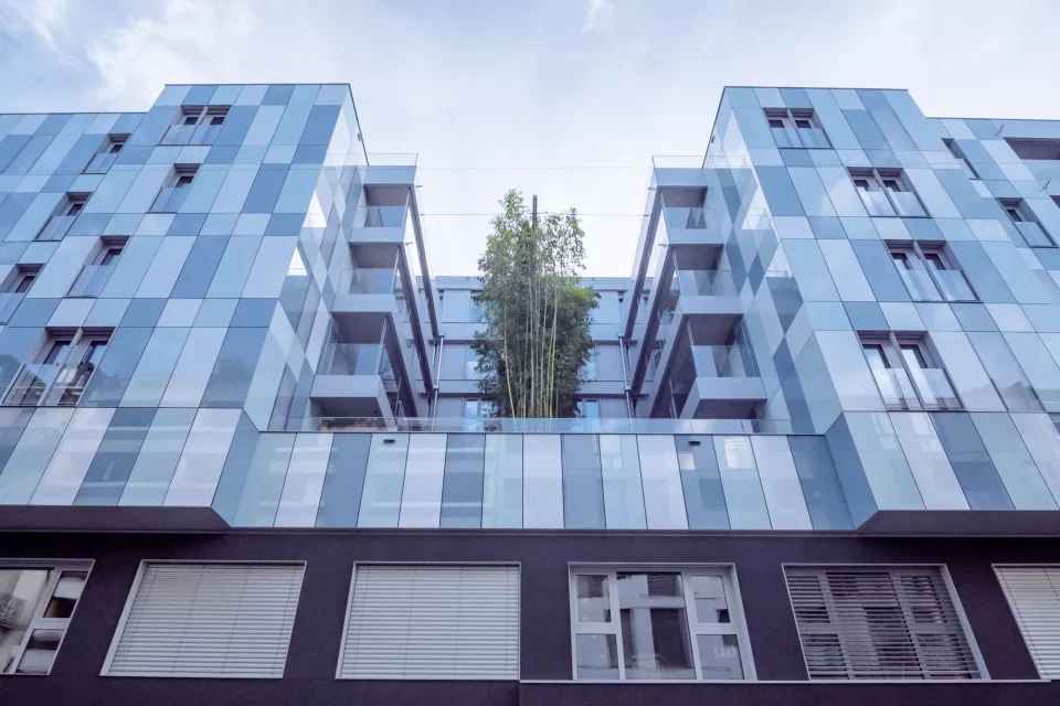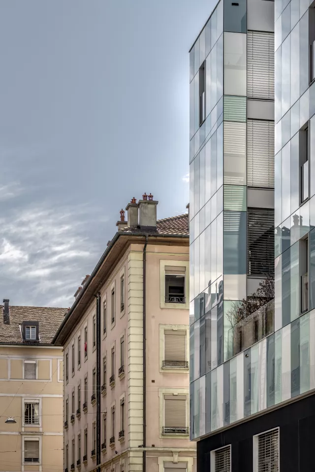 Au cœur du quartier des Pâquis, l’ancien bâtiment, qui accueillait autrefois la centrale téléphonique de Swisscom, a été réaménagé en collaboration avec Reynaud-Gaillard architectes. Le rez-de-chaussée et le premier étage de la structure d’origine ont été conservés, tandis que de nouveaux niveaux ont été ajoutés. L’ensemble du projet a permis de créer soixante-sept logements.