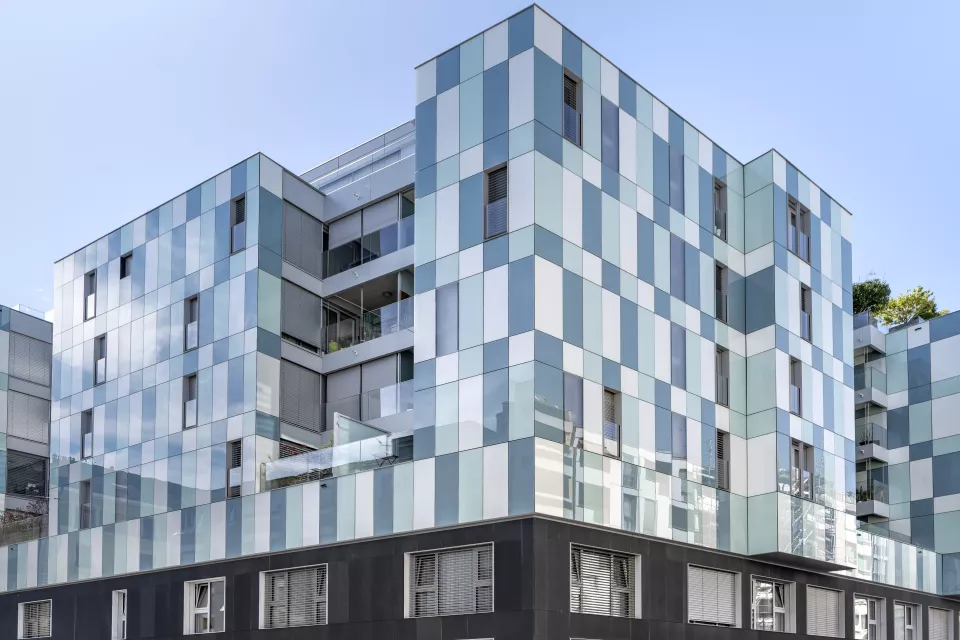 Le socle, bien ancré au sol, est massif, accueillant pour quelques années encore le centre de Swisscom. Les étages, quant à eux, s'élèvent avec légèreté dans le ciel. Le jeu de renfoncements permet de créer des espaces semi-privés où sont posés les balcons, évitant ainsi le bruit des rues adjacentes. Les panneaux composant les façades sont de différentes teintes de bleu, variant perpétuellement avec le changement du ciel et la course du soleil.