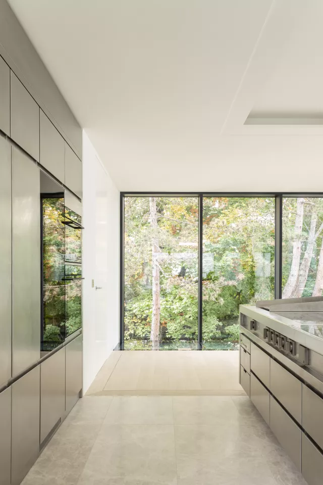 La première villa s’ouvre sur une entrée accueillant un bureau-studio indépendant. Un mur et un patio d’inspiration japonaise structurent l’espace entre les deux villas et apportent de la lumière jusqu’à la cave à vins. Depuis l’entrée, une circulation horizontale mène au cellier-cuisine, à l’ascenseur, au bloc sanitaire et à un patio traversant les deux niveaux, révélant le piano nobile articulé majoritairement en plan libre et ouvert.