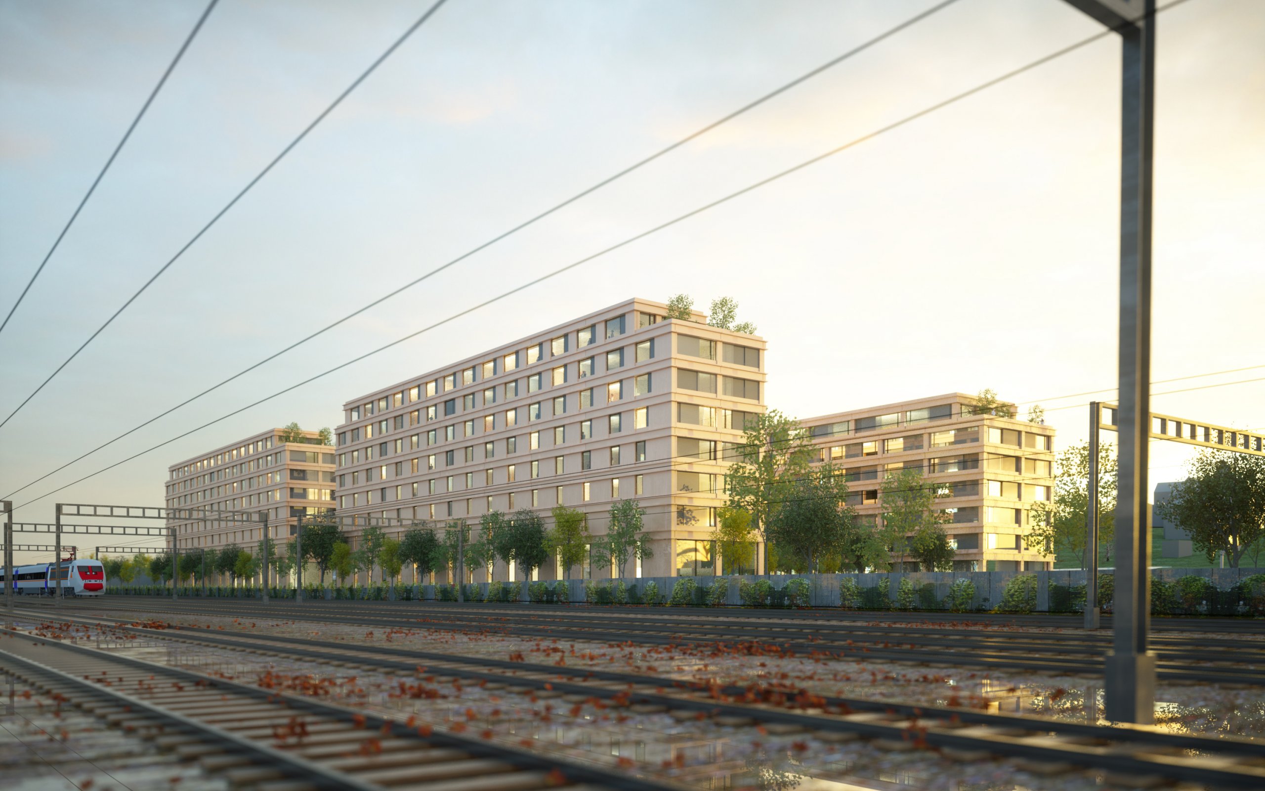D’un point de vue formel, la composition des façades est rigoureuse, les ouvertures généreuses et horizontales côté cour contrastent avec l’écriture défensive des façades le long des voies CFF. Les trames sont puissantes et réglées, et les pieds d’immeubles participent largement à l’animation du quartier en s’ouvrant sur l’espace public et le groupe scolaire au nord de l’ensemble.