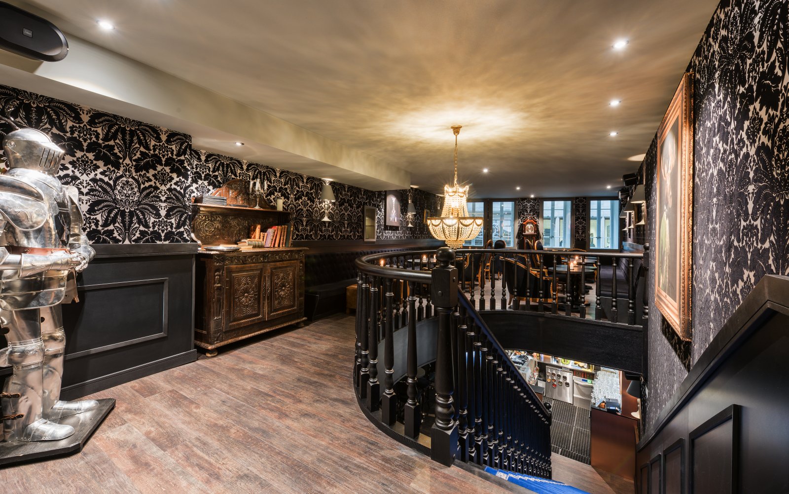 Le choix des objets surréels apporte l’esprit excentrique des collectionneurs anglais et ses cabinets de curiosités. Les tonalités foncées des meubles et murs harmonisent les objets de différentes couleurs et formes. Certains éléments de mobilier ont été dénichés chez des antiquaires et rénovés. Les tableaux accentuent l’idée de dynastie avec humour.