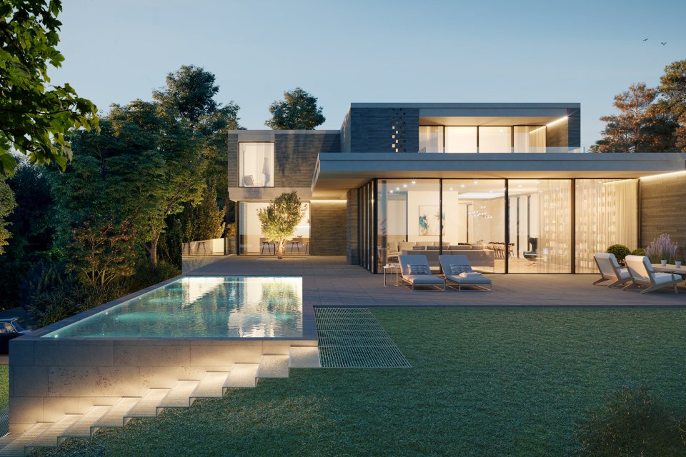 La villa Lac se veut volontairement compacte et minérale, instaurant un équilibre presque naturel dans un site largement végétalisé.